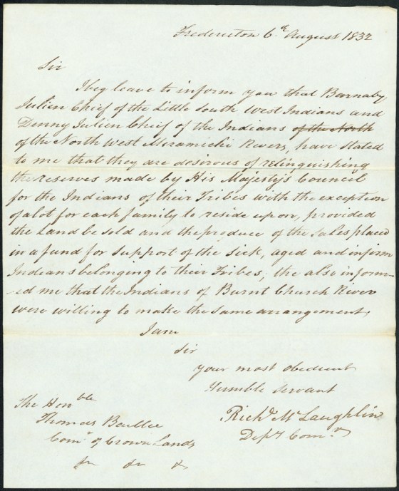 Fredericton 6th August 1832 To: The Honourable Thomas Baillie, Commissioner of Crown Lands Re: The Indian Lands on Miramichi and…